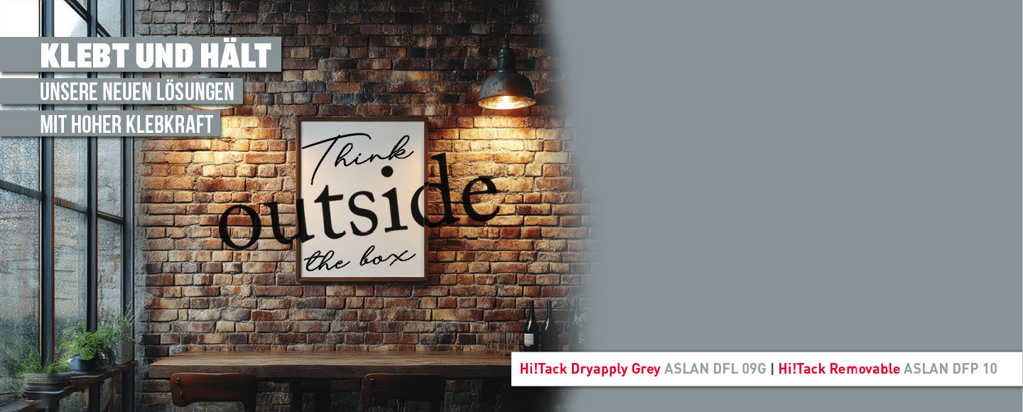 Wir begrüßen nicht nur das Jahr 2025, sondern gleich auch zwei neue, stark klebende Digitaldruckfolien im Portfolio von ASLAN, die sich für Verklebungen auf schwierigen Untergründen eignen: Hi!Tack Dryapply Grey ASLAN DFL 09G und Hi!Tack Removable ASLAN DFP 10.