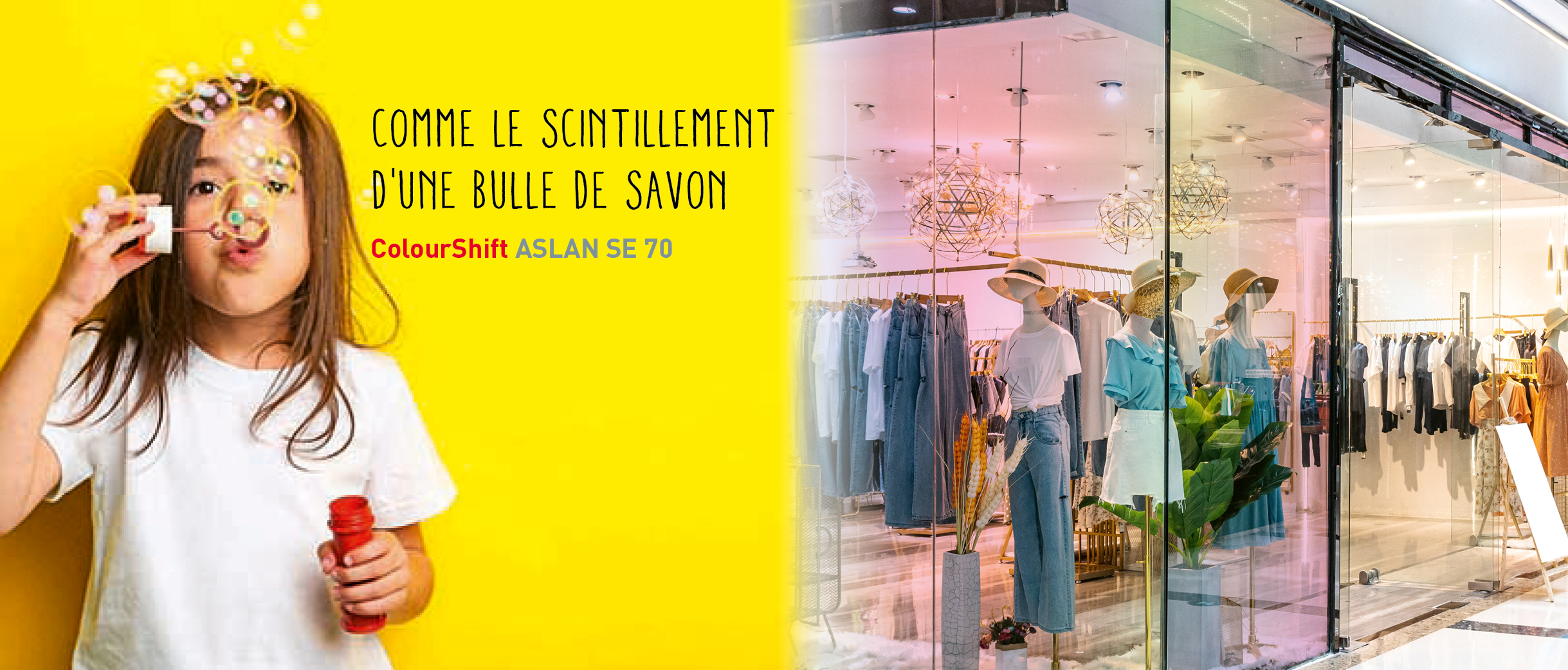 Le film adhésif transparent ColourShift ASLAN SE 70 est un en polyester brillant de 110 µm avec une enduction spéciale. Les deux effets, Nebula et Solar, sont aussi bien adaptés aux applications intérieures qu’extérieures sur surfaces planes.