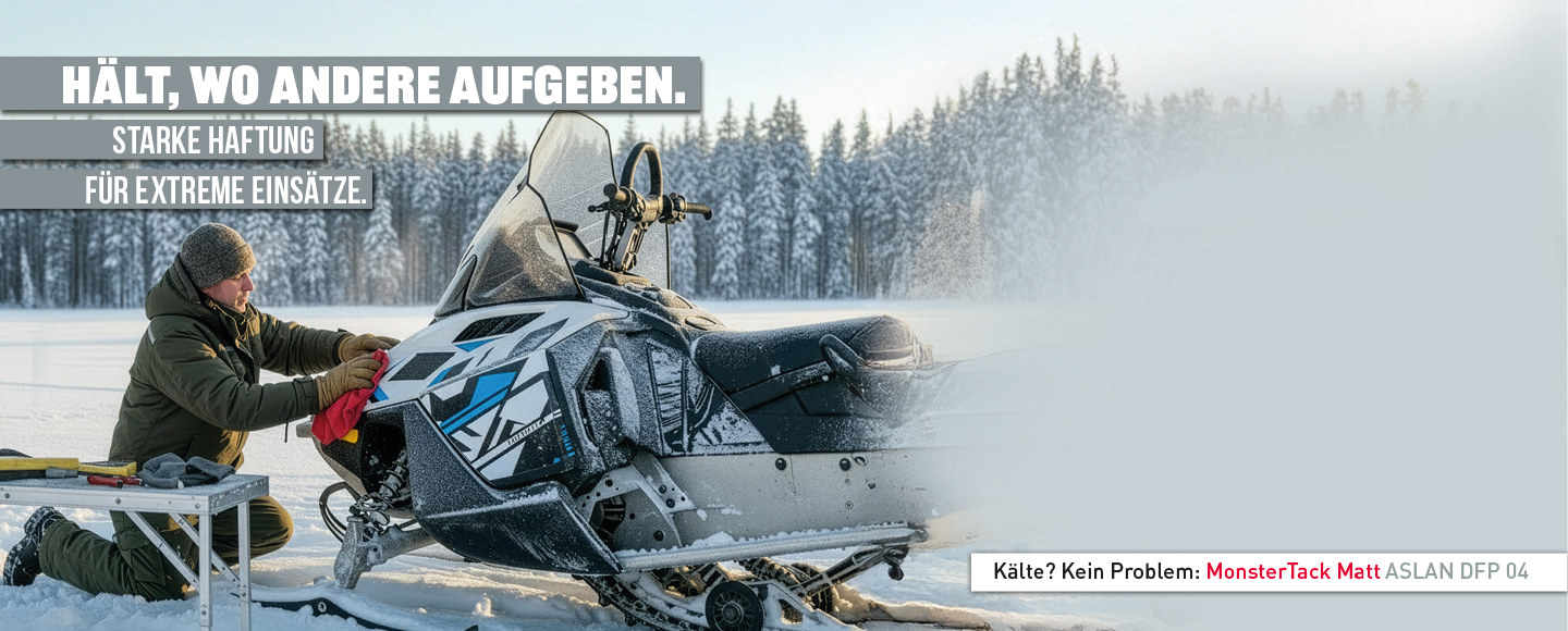 MonsterTack Matt ASLAN DFP 04 setzt neue Maßstäbe in Sachen Haftkraft. Besonderes Highlight ist die Verklebbarkeit bereits ab -10 °C, die auch unter frostigen Bedingungen professionelle Ergebnisse ermöglicht. Die matte Digitaldruckfolie erreicht eine beeindruckende Haftkraft von bis zu 34 N und bietet damit extremen Halt selbst auf anspruchsvollsten Untergründen – von niederenergetischen Kunststoffen über Metalle bis hin zu pulverbeschichteten Oberflächen.