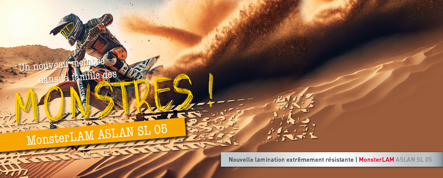 Un Monstre ne vient jamais seul ! Dès à présent, la nouvelle lamination extrêmement résistante MonsterLAM ASLAN SL 05 est disponible, avec ses 300 µm d’épaisseur, qui protègeront vos impressions numériques dans les conditions les plus difficiles - même vos impressions UV. Uniquement lorsque combiné avec le film d’impression numérique MonsterTack ASLAN DFP 05, on obtient un composite résistant aux vapeurs de solvants et aux huiles de graissage, et parfait pour les applications telles que l'utilisation comme Kits de Motos, pour sports mécaniques et sur les engins de chantier.